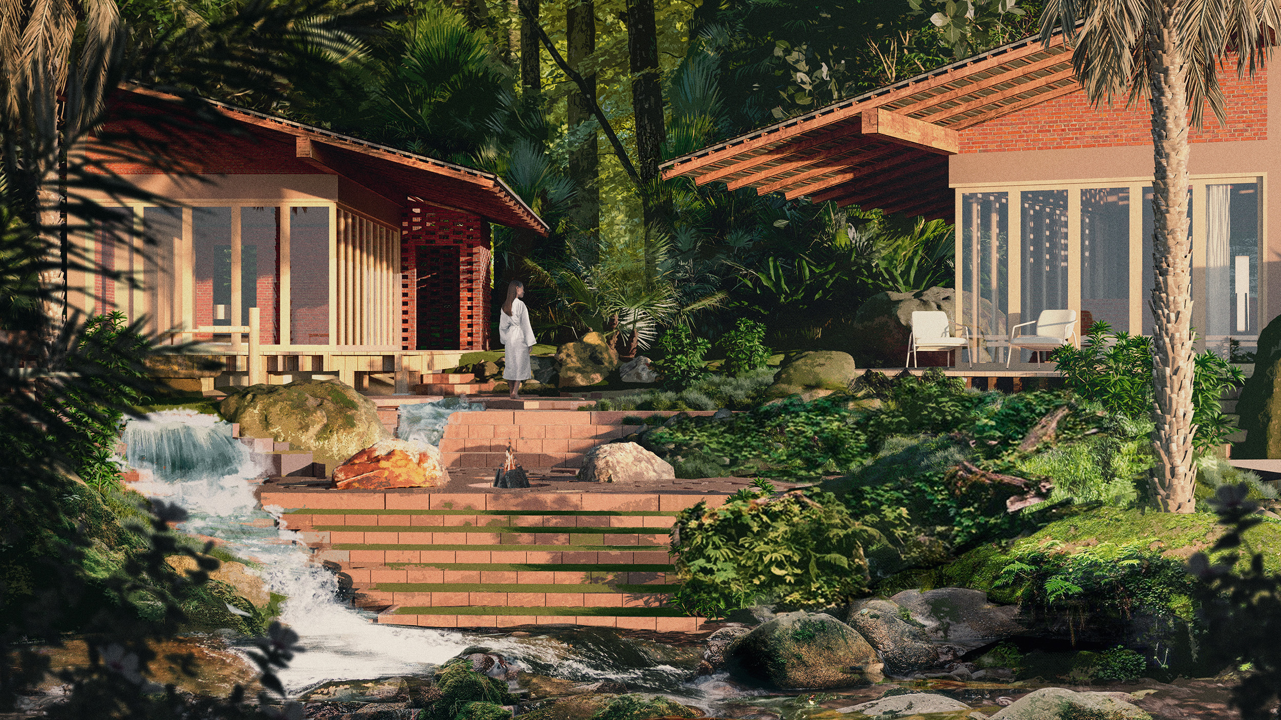 This project is a health and wellness retreat center for intensive healing programs focused on immersion and wholistic mental health recovery programs for substance abuse victims. The program includes resting areas, steam treatment, aroma therapy, traditional Thai massage, and guided meditation spaces. Located next to a mountain stream, the project is focused on providing peaceful seclusion and healing.